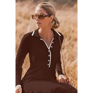 Show moreStep into style with the MEROKEETY Women's 2024 Long Sleeve Sweater Dress, expertly crafted to merge elegance with comfort. This versatile dress is made from a soft and skin-friendly ribbed knit fabric, designed to embrace your body while elegantly highlighting your silhouette. Featuring a chic lapel collar and a button-down front, this dress's unique blend of **high elasticity** and **slim-fitting** design makes it a perfect fit for multiple body types. The solid color with contrast trim at the cuffs and collar gives an extra touch of sophistication, ensuring you always stand out in the crowd.
