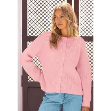 MEROKEETY Women's 2024 Long Sleeve Cardigan Sweater Crew Neck Button Ribbed Open Front Knit Outerwear, LightPink, S