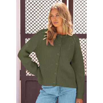 MEROKEETY Women's 2024 Long Sleeve Cardigan Sweater Crew Neck Button Ribbed Open Front Knit Outerwear, ArmyGreen, XL