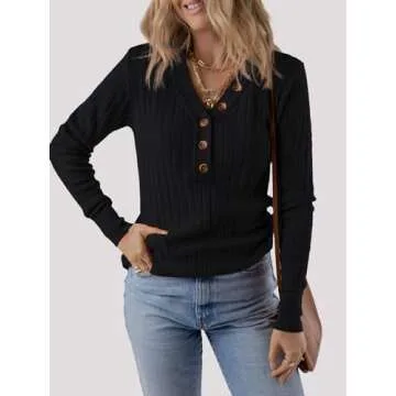 MEROKEETY Women's 2024 Long Sleeve V Neck Ribbed Button Knit Sweater Solid Color Tops Black