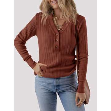 Show moreIntroducing the MEROKEETY Women's 2024 Long Sleeve V Neck Ribbed Button Knit Sweater, a stunning addition to your autumn wardrobe! Perfectly blending comfort with style, this top is made from a soft and stretchy ribbed fabric that hugs your figure without sacrificing breathability. The elegant v neckline and slim-fit silhouette create a flattering look that can transition from casual days to chic evenings effortlessly. Paired with vibrant colors and a unique half button-down front, this basic yet fashionable top is designed to elevate any outfit.