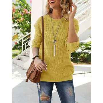 MEROKEETY Women's 2024 Long Sleeve Waffle Knit Sweater Crew Neck Solid Color Pullover Jumper Tops Mustard