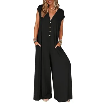 Show more Introducing the MEROKEETY Women's 2024 Summer Cap Sleeve Jumpsuit, the ultimate blend of comfort, style, and functionality for your summer wardrobe! This stunning black onesie, expertly crafted from high-quality, stretchable knit fabric, promises a soft touch against your skin while keeping you cool and breathable on those warm sunny days. The deep V-neck design with a chic button front adds an elegant flair, while cap sleeves lend a trendy silhouette that flatters every figure. With its loose waist and shapeless fit, it offers both trendiness and ease of movement – a perfect choice for women on the go!
