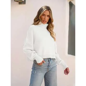 Show more This women's turtleneck crop sweater is the essence of style and comfort, perfect for the chilly days and cool evenings of early spring, fall, and winter. Crafted from skin-friendly knitted fabric, this sweater is soft to the touch, warm, and stretchy, embracing you in cozy warmth. Its modern design features a warm turtleneck, drop shoulder, and batwing long sleeves, creating a relaxed and oversized fit. The cropped length and high-low hem not only add a trendy edge but also makes it a versatile piece that can be effortlessly paired with high-waisted jeans, skirts, or trousers for various stylish outfits.