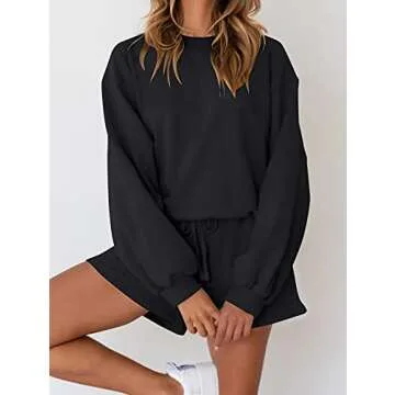 Show more Step into ultimate comfort and style with the MEROKEETY Women's 2025 Fall Oversized Batwing Sleeve Lounge Sets. This beautifully crafted two-piece sweatsuit set includes a cozy long sleeve batwing sweatshirt and high-waisted shorts, making it perfect for lounging at home or running errands. Made from soft, gentle fabric that keeps you warm while remaining breathable, this outfit is designed for all-day wear, allowing you to relax in style. The versatile black color adds a touch of elegance, making it a staple in your wardrobe for the upcoming fall season.