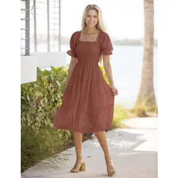Show more Embrace your summer style with the MEROKEETY Women's 2025 Summer Boho Square Neck Smocked Solid Color A Line Beach Midi Maxi Dresses. This stunning dress, in a chic mauve hue, is designed to make you not only look fabulous but feel fantastic too. With a blend of unique features such as a flattering square neckline and puff short sleeves, it embodies the perfect combination of comfort and elegance. The below knee length design provides added coverage while keeping you cool during warm days. The lightweight, flowy fabric drapes beautifully, making it ideal for a variety of occasions from beach outings to romantic dinners.