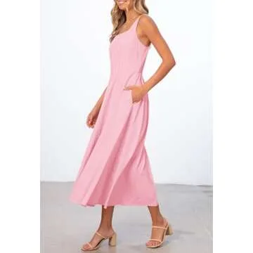 Show more This stunning midi dress is an essential addition to any woman's wardrobe for the summer season! Made from soft and lightweight fabric, this dress ensures all-day comfort while exuding style. The sleeveless square neck design highlights the collarbone beautifully, while its elastic back and high waist create a flattering silhouette for various body types. The flowy A-line skirt, adorned with a charming ruffled hemline, sways gracefully, reminiscent of dancing petals on a warm summer day.