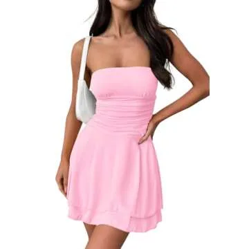 MEROKEETY Women's 2025 Summer Strapless Tube Dress Sexy Off Shoulder Ruffle Tiered Flowy Mini Dresses, Pink, S