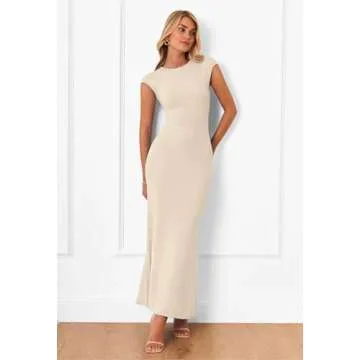 MEROKEETY Women's Cap Sleeve Rib Knit Maxi Dress Crew Neck Slim Fit Bodycon Summer Sweater Dresses, Apricot, M