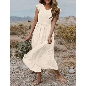 MEROKEETY Women's Flutter Sleeve Smocked Midi Dress V Neck Casual Tiered Dresses with Pockets, Beige, M