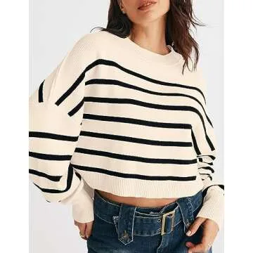 MEROKEETY Women's Long Sleeve Crew Neck Striped Crop Sweater Ribbed Knit Pullover Jumper Tops, Apricot, X-Large