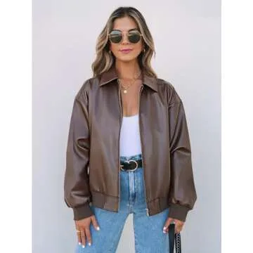 MEROKEETY Women's Oversized Faux Leather Jacket Fall Winter Zip Up Motorcycle Coats Fashion Outfits Clothes 2024, Coffee, L