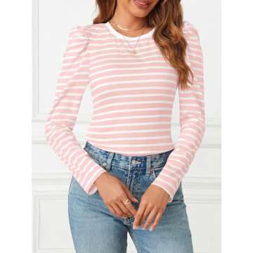 Show more This stunning women's long sleeve top is your go-to piece for effortless style and comfort! Crafted with a blend of soft, lightweight knit fabric, it provides maximum comfort while ensuring you look effortlessly chic. The puff sleeves with pleated details add a hint of sweetness, making it a perfect choice for both casual and semi-formal occasions. Featuring a trendy round neck and a striking color block stripe design, this top stands out while offering a loose fit that's flattering on any body shape.