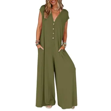 Show moreIntroducing the MEROKEETY Women's Short Sleeve One Piece Jumpsuit, an epitome of comfort and style. Designed for the modern woman, this jumpsuit features a deep V-neck with a chic four-button front, enhancing its fashionable appeal. The high-quality, stretchable knit fabric is not only super soft and breathable but also skin-friendly, making it the perfect choice for warm summer days. The jumpsuit showcases a unique combination of a slightly fitted top that gracefully flows into wide-leg pants, providing a relaxed fit that flatters all body types. Whether you're dressing up for a day out or looking for a comfortable outfit for home lounging, this versatile one-piece is ready to take you from morning to evening effortlessly.