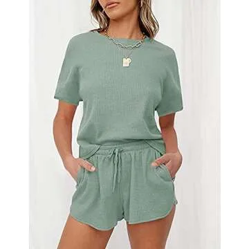 Show moreThe MEROKEETY Women's Short Sleeve Waffle Pajama Sets Lounge Top and Shorts are designed to elevate your loungewear game while providing maximum comfort and style. This **2-piece tracksuit outfit** features a **crew neck tee shirt top** made from *breathable and lightweight fabric* that ensures you stay cool even on hot summer days. The **solid color** design is complemented by a *relaxed loose fit*, making it an ideal choice for a variety of occasions. The *short, dolphin-style shorts* are equipped with pockets and an elastic drawstring waist, adding both functionality and a trendy silhouette to your ensemble, perfect for lounging, light exercises, or running errands. This pajama set is the quintessential blend of *style and comfort*, crafted from a soft, stretchy waffle knit that feels delightful against your skin.