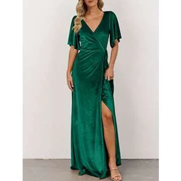Show more Step into sophistication with the MEROKEETY Women's V Neck Velvet Formal Dress. Designed for the modern woman, this enchanting piece features a luxuriously soft velvet fabric that caresses the skin while providing a stunning silhouette. The elegant v-neck design accentuates your neckline beautifully, and the ruffle sleeves add a trendy yet classic touch to the overall look. With a slim wrap design that hugs your curves in all the right places, this dress not only defines your waist but also offers adjustable comfort through its charming tie. The split hem enhances your graceful movement, showcasing your legs and making it an effortlessly chic choice for any event.