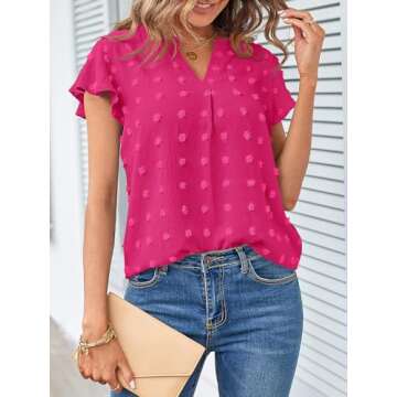 MEROKEETY Women V Neck Flowy Short Sleeve Swiss Dot Blouse Business Casual Loose Shirt Top HotPink Large