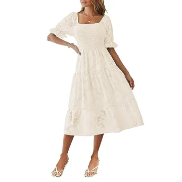 Show moreIntroducing the MEROKEETY Women's 2024 Summer Short Puff Sleeve Smocked Square Neck Floral Textured Tiered Midi Dress, your perfect companion for the sun-kissed days ahead! Crafted with a soft floral textured chiffon fabric, this dress drapes beautifully against your figure, offering both comfort and style. With a square neckline and semi-sheer short puff sleeves, it adds a touch of whimsical elegance to your summer wardrobe. The elastic high waist cinches the bodice perfectly, while the flowy tiered skirt cascades below the knee, ensuring you look stunning from every angle.
