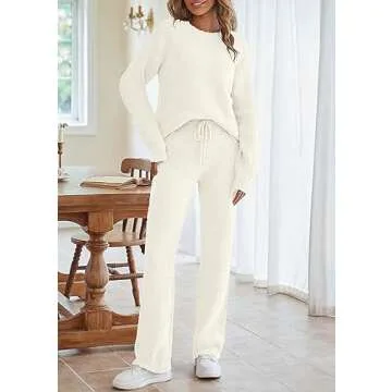 The set includes a long sleeve crew neck sweater pullover and drawstring pants, both crafted from a fuzzy fleece material that exudes warmth. The relaxed fit is incredibly flattering, and its true-to-size design ensures you feel both comfortable and chic. With ribbed knit hems and solid colors, this outfit offers a classic look that is effortlessly stylish.