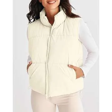 MEROKEETY Womens Puffer Vest Stand Collar Zip Up Sleeveless Padded Gilet Coat with Pockets, Beige, Large