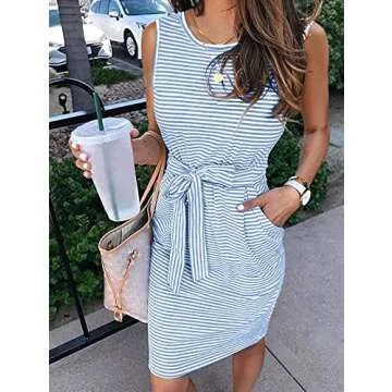 Show moreIntroducing the stunning MEROKEETY Women's Summer Sleeveless Striped T-Shirt Dress, a perfect fusion of elegance and functionality, designed with the modern woman in mind. Crafted from high-quality, stretchy cotton fabric, this dress promises exceptional softness and a flattering fit that shifts effortlessly from day to night. Its unique striped print and simple crew neck design adds a touch of contemporary style to your wardrobe, making it an essential piece for any occasion. The tie waist feature beautifully accentuates your curves, ensuring that you look your best wherever you go. With the added practicality of two deep, functional pockets, you can comfortably carry your essentials, allowing for a hands-free experience without sacrificing style.