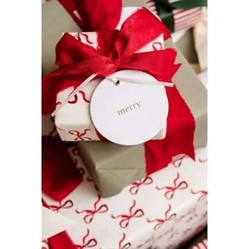 Merry Market Christmas Holiday Letterpress Gift Tags, Gold Foil, Merry, to and with Love, Set of 25 Paper Tags with Satin Ribbon, Round