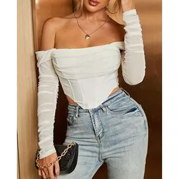 Mesh Sheer Long Sleeve Corset Crop top Ruched off Shoulder Blouse Push Up Party Boned Bustier for Cute Women Trendy