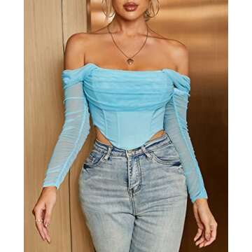 Show moreStep into the spotlight with the exquisite Mesh Sheer Long Sleeve Corset Crop Top. Tailored for the modern woman, this chic blouse features a stunning ruched design and an off-shoulder silhouette that highlights your collarbone while allowing you to show off your sense of style. Crafted from lightweight mesh fabric, it offers the perfect blend of comfort and elegance, ideal for parties, nights out, or any trendy occasion. The push-up boned bodice enhances your curves, creating a flattering figure that draws attention while ensuring you feel confident and fabulous.
