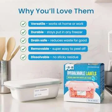 Show moreTransform your kitchen organization with the MESS Dissolvable Freezer Labels. These innovative labels are designed to make kitchen cleanup a breeze, taking away the hassle of stubborn residue and messy stickers. Simply apply them to any food container, and when it’s time for cleanup, just rinse with water and watch them dissolve effortlessly! Crafted from a unique material, these 100% washable kitchen labels ensure that you can say goodbye to grime from traditional labels that cling stubbornly to surfaces.