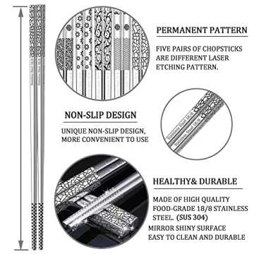 When compared to other chopsticks on the market, our Metal Chopsticks stand out due to their **sturdier construction** and **unique designs**. While many alternatives are made from lower-quality materials and often lack comfort and grip, our chopsticks use robust 18/8 stainless steel which combines both elegance and strength. Others may skimp on the laser engraving or the anti-slip features that make eating enjoyable and easy. This makes our product not only a healthier choice but also an appealing option for both home cooks and professionals alike.