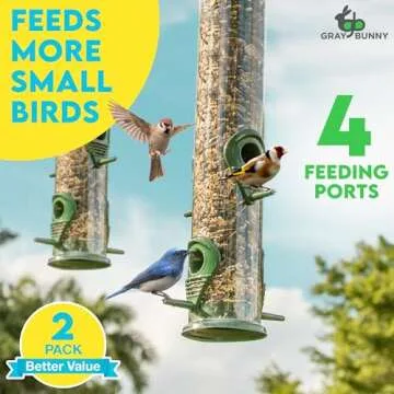 Show more Transform your garden into a vibrant haven for feathered friends with our extraordinary 2-Pack Metal Bird Feeders. Designed with FOUR FEEDING PORTS, these feeders allow multiple birds to feast at the same time, creating a lively spectacle right outside your window. Suitable for a variety of seeds including sunflower seeds and mixed blends, these feeders are perfect for attracting a diverse range of birds such as woodpeckers, goldfinches, and blue tits. Crafted with high-quality metal components, including chew-proof feeding ports and an enduring power-coated finish, these feeders are built to withstand the elements and resist damage from squirrels, ensuring that your backyard remains a sanctuary for the birds.