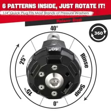 Show more The Meteor Blast 6-in-1 Quick Adjustable Nozzle is a remarkable innovation for anyone serious about achieving peak cleaning performance. Designed specifically for use with pressure washers, this nozzle features 6 different fast-switching spray patterns, including Standard, Soap, and various angles to tackle a myriad of cleaning tasks. Switching between the various spray patterns is as simple as a rotation—no hassle, just seamless cleaning!