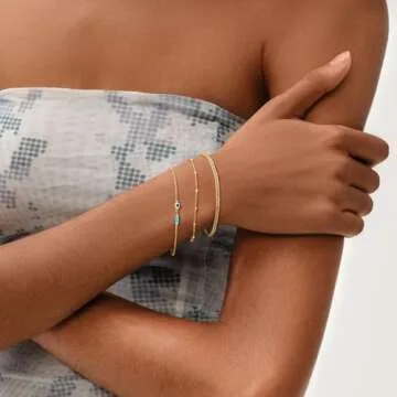 MEVECCO Bracelet for Women Gold Evil Eye Ball Turquoise Trio Bead Wire Wrapped 14K Gold Plated Dainty Chain Handmade Simple Protection Jewelry