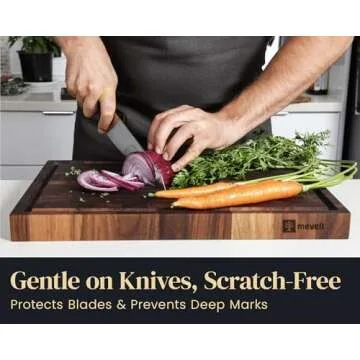 With its reversible design, the Mevell cutting board offers ultimate versatility. Use the top surface for carving, chopping, and cutting meats, or showcase your gourmet dishes by serving a perfectly cooked steak right on the board. Flip it over to the back side, which excels at mincing vegetables, slicing bread, or serving cheese – making it the ideal all-in-one kitchen companion. The thoughtful incorporation of juice grooves ensures that any runoff from juicy fruits or meats is contained, keeping your countertops clean and tidy.