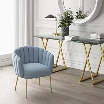 Show moreMEXIYA Doloris Modern Sea Blue Easy Clean Velvet Upholstered Feather Side Chair is the perfect blend of luxury and modern design. With its unique feather-shaped backrest and stunning sea blue velvet upholstery, this chair elevates any space it's in. The high-quality, easy-to-clean velvet fabric allows for effortless maintenance — stains can be easily wiped away with a damp cloth. The plush, dense foam cushion and backrest ensure optimal comfort, while the sophisticated brushed gold stainless steel legs add a touch of glamour to the overall aesthetic. At dimensions of 25.6 inches wide, 23.6 inches deep, and 29.1 inches tall, it strikes the ideal balance between style and functionality, making it a standout piece in your living area, dining room, or bedroom.