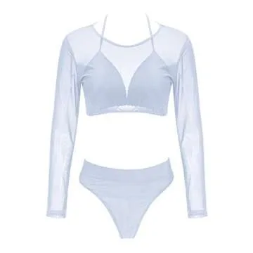 Meyeeka Womens Sexy Mesh Long Sleeve High Waist 3 Piece Bikini Swimsuit White S