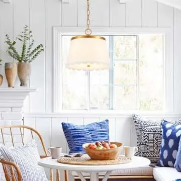MhyTogn Flower Pendant Lighting, Modern Chandelier with Cream White Fabric Drum and Antique Brass Brush Paint Finish Shade for Nursery Kids Room Bedroom Kitchen Hallway Entryway 3-Light