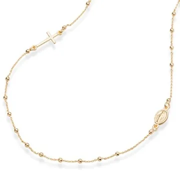 Show moreEmbrace your spiritual side with the Miabella 18K Gold Over 925 Sterling Silver Italian Rosary Beaded Sideways Cross Necklace. This exquisite piece combines the timeless beauty of Italian craftsmanship with a modern twist, featuring a Miraculous Medal of the Virgin Mary, a polished cross, and small round beads. Perfect for those who seek both inspiration and style, this necklace serves as a symbol of faith or a chic fashion statement. Crafted from hypoallergenic and nickel-free sterling silver, plated with a thick layer of 18K yellow gold, it's designed for durability and comfort, making it ideal for sensitive skin. Whether you're dressing up for a special occasion or adding a touch of elegance to your everyday look, this necklace is versatile enough to complement any outfit.