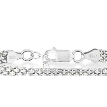Show more Introducing the Miabella 925 Sterling Silver Italian Bismark Mesh Link Chain Bracelet – a stunning accessory that seamlessly blends elegance and contemporary style. Crafted from high-quality 92.5% sterling silver, this beautiful bracelet boasts a 6mm narrow design that showcases interlocking links, offering smooth flexibility and a radiant shine that captures light beautifully. Made in Italy, this bracelet reflects a rich tradition of craftsmanship and attention to detail, ensuring that every piece is not only fashionable but also remarkably durable. Perfect for the modern woman, it can effortlessly elevate any outfit, whether you're going for a casual brunch or a formal evening event.