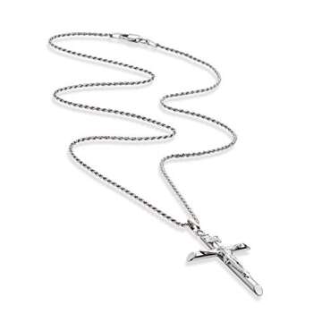 Show moreDiscover the timeless elegance and deep meaning behind the Miabella Rhodium Plated 925 Sterling Silver Crucifix Necklace. Crafted in Italy, this exquisite necklace features a beautifully detailed crucifix pendant representing faith and devotion. The pendant, which hangs gracefully from a solid sterling silver rope chain, measures 1 3/8 inches long, making it a striking yet understated accessory perfect for any outfit. Its rhodium-plated finish not only enhances its shine and luster but also ensures durability, making it an ideal piece for everyday wear.
