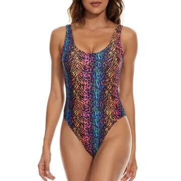MIAIULIA Women's Retro 80s/90s Inspired High Cut Low Back Padding One Piece Swimwear Bathing Suits Animal Feather M