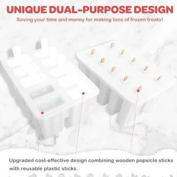 Miaowoof Homemade Popsicle Molds, 10-Cav Non-BPA Silicone Ice Pop Maker, with 50 Sticks, 50 Bags, 10 Reusable Sticks, Funnel, Brush and Ice Pop Recipe (White)