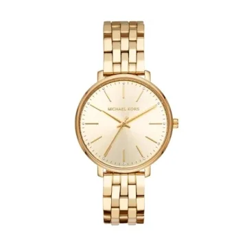 Introducing the exquisite Michael Kors Pyper watch, a stunning accessory that perfectly blends elegance and functionality. This timepiece showcases a radiant gold-tone sunray dial adorned with sleek gold-tone stick indexes, enhancing its sophisticated appearance. The watch boasts a reliable quartz movement, ensuring accurate timekeeping with a three-hand analog display that is both stylish and easy to read. Crafted with a robust round 38mm stainless steel case, the watch is designed to withstand...