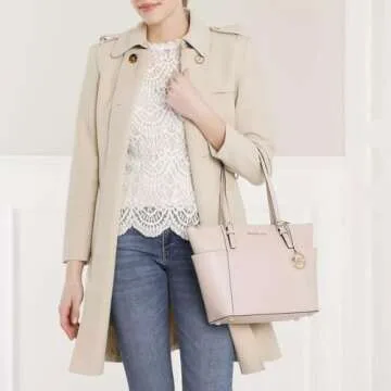 Show moreIntroducing the Michael Kors Jet Set Saffiano Leather Tote Handbag in Soft Pink – a luxurious accessory that effortlessly combines sophistication with functionality. Crafted from premium saffiano crossgrain leather, this handbag not only boasts a stunning soft pink hue that complements any wardrobe but also features durable textile linings designed for everyday use. With dimensions of 10.5" x 15" x 4.5", it provides ample space for all your essentials while maintaining a stylish silhouette that’s perfect for any occasion. Elevate your style game with its flashy goldtone hardware and signature branding, making it a must-have for fashion-forward individuals.