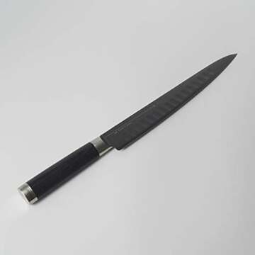 The blade is made of three layers of stainless steel and coated with titanium carbon nitride for durability and exceptional sharpness.