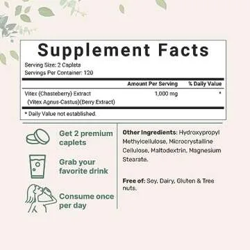 Show more Introducing the Micro Ingredients Vitex Berry Supplement, your essential partner in achieving hormonal balance and enhancing overall wellness! With each serving delivering an impressive 1,000mg of potent Vitex extract, or 500mg per caplet, these premium caplets are meticulously crafted from fresh, authentic Vitex agnus-castus, also known as the chaste tree. Designed for both men and women navigating their intimate health journeys, this convenient pouch contains 240 high-concentration caplets—enough to support you for up to 120 days.