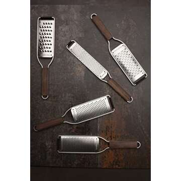 Show more Elevate your culinary experience with the Microplane Master Series Stainless Steel Grater and Zester 5 Piece Gift Set. This meticulously crafted set includes five essential tools: a Zester, Fine Grater, Coarse Grater, Extra Coarse Grater, and Ribbon Grater, each designed to unleash the full potential of your ingredients. Engineered in the USA, the ultra-sharp blades are made from high-quality US stainless steel, ensuring precision and durability for all your grating and zesting needs. The elegant walnut wood handles not only add a touch of sophistication to your kitchen but also provide a secure grip that enhances both speed and safety during use.