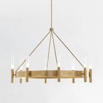 Show moreIlluminate your space with the stunning Mid-Century Geometric Ribbed Glass Chandelier, a perfect blend of vintage charm and modern elegance. Its design draws inspiration from the distinctive aesthetics of mid-century modern architecture, boasting beautiful ribbed glass shades that not only diffuse light softly, but also serve as a stunning focal point in any room. Crafted with a robust steel construction, complemented by a rich brass finish, this chandelier adds sophistication and style to your dining room, foyer, or any indoor setting. Perfect for those who appreciate timeless design with a touch of creativity, this chandelier brightens up your space while showcasing your unique taste.