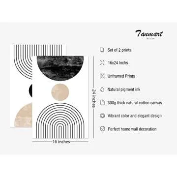 Show more Transform your living space with our stunning Mid Century Modern Wall Art Prints Set of 2. These exquisite pieces of art are designed to elevate the aesthetic of any room. Measuring an impressive 16x24 inches, each unframed print showcases a captivating neutral abstract geometric design that seamlessly blends bohemian elements with modern sophistication. Crafted from thick natural canvas and printed using eco-pigment, these artworks boast high-definition giclee quality that provides a rich texture and an artistic flair to your home décor.