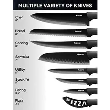 Show more Experience the perfect blend of elegance and efficiency with the MIDONE Kitchen Knife Set. This stunning 17-piece knife collection is crafted from German high carbon stainless steel, designed for precision and durability. Each knife features hand-polished edges that are expertly tempered to a sharp 16-degree angle, making them not only exceptionally sharp but also incredibly versatile. From the largest chef's knife to the smallest paring knife, every blade in this set is engineered for excellence and will have you slicing, dicing, and chopping with ease. The sophisticated black appearance of these knives, coupled with a stylish acrylic block, adds a modern touch to any kitchen décor while also keeping your knives organized and accessible.